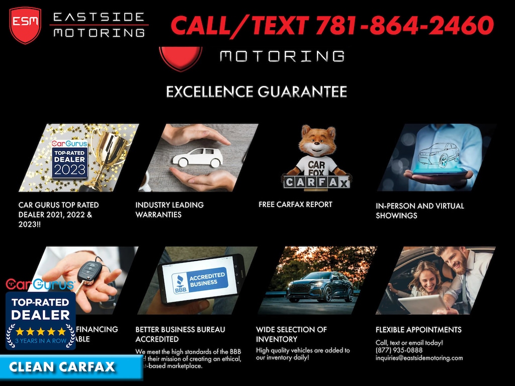 Eastside Motoring is proud to be recognized as a CarGurus Top Rated dealer, ensuring that you can buy from us with confidence. We ship our vehicles to all 50 states, delivering them right to your front door. Every vehicle undergoes a rigorous 145-point safety and mechanical inspection, with all services up to date, so you can rest assured that you are getting a safe and reliable vehicle.